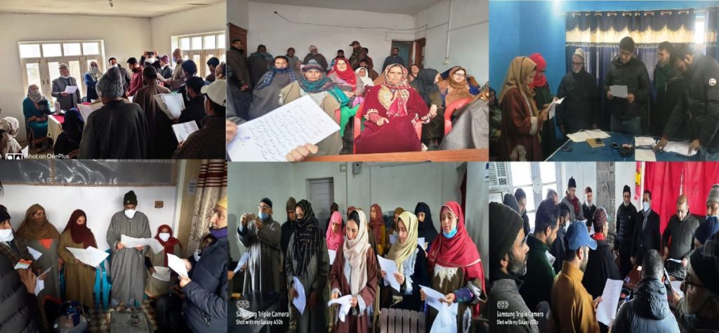 KUPWARA, DECEMBER 30: Newly elected Sarpanches and Panches were administered oath today by the concerned Block Development Officers in Kupwara district. This was followed after 13 District Development Council members took oath at Town Hall Kupwara on Monday this week after registering their victory in recent maiden DDC election.