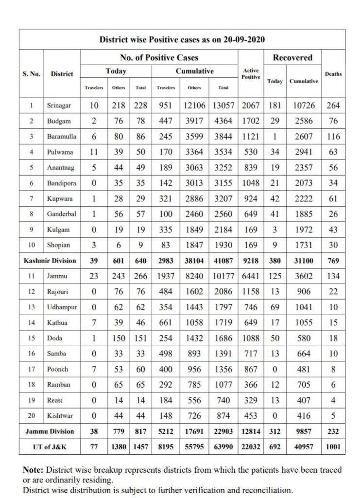 Srinagar, Sept 20 :- 77 travelers were among 1457 fresh covid-19 cases reported in Jammu and Kashmir in last 24 hours, taking its total count to 63990.