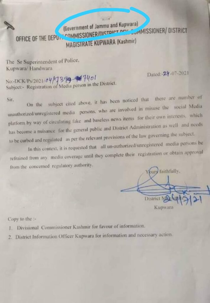 “Government of Jammu and Kupwara” and directed SSP Kupwara to refrain media persons till they sought registration or approval. Though there is no clear order as where from these media persons will get approval and what is the procedure for registration.