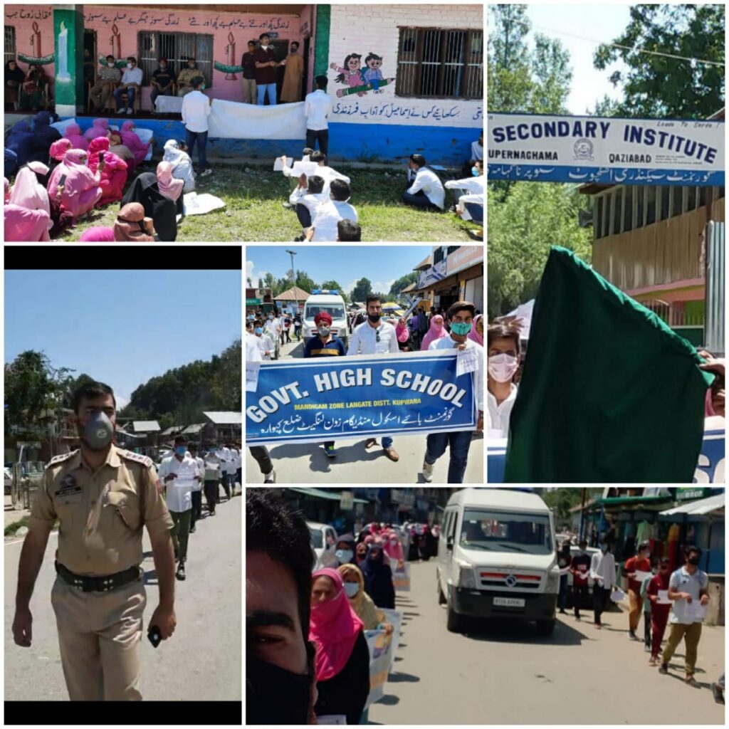 KUPWARA, AUGUST 10: On the directions of Deputy Commissioner Kupwara Imam Din, an awareness rally regarding COVID-19, was taken off from Boys HS Supernaghama today. The rally, coordinated by District Information Centre Kupwara , was attended by school children from BHSS M H Pora, HS Mandigam and HS Supernaghama besides Angan Wadi Workers of ICDS, ASHAs of health department, went through various markets of Kralgund and culminated at BMS Kralgund. The students were seen with placards and banners in their hands displaying message that people in general should not show any negligence with regard to compliance of Covid Appropriate Behaviour. The message was that people should not lower the guard against COVID-19 pandemic, else should follow COVID-19 SOPs in letter and spirit.