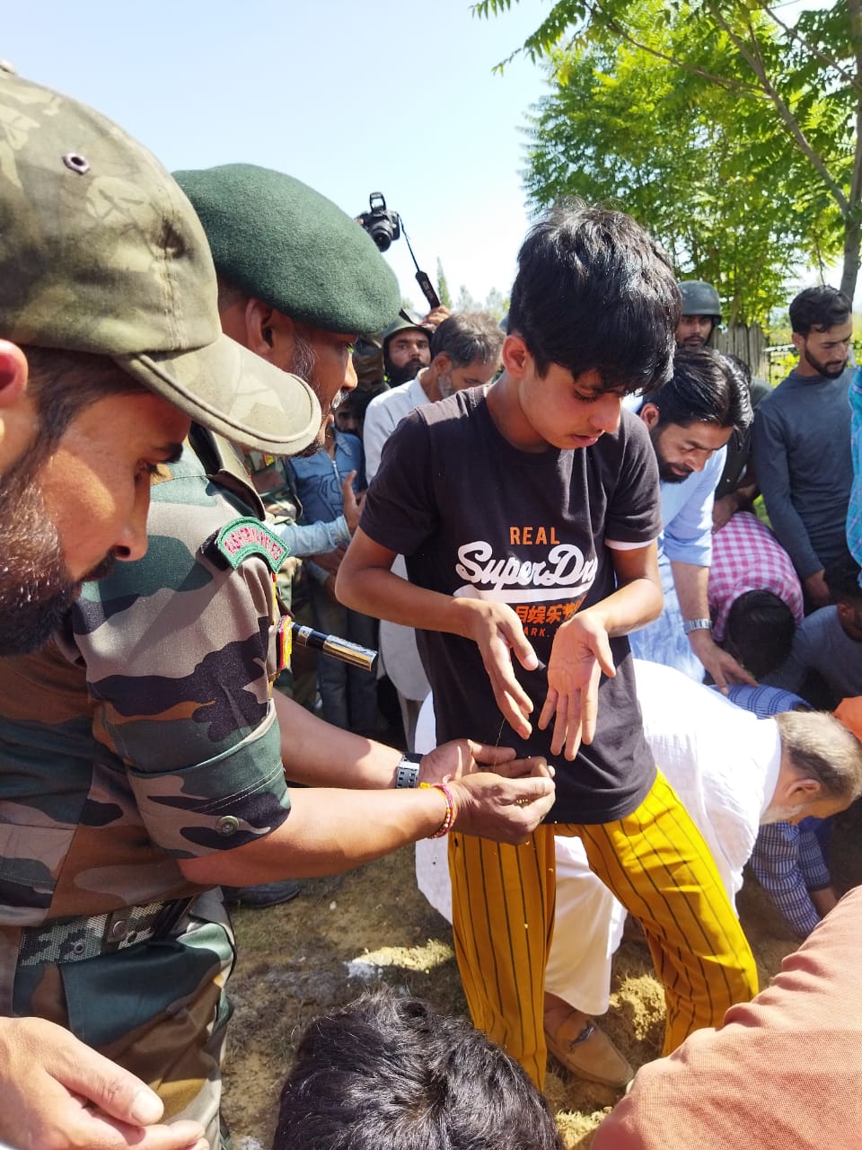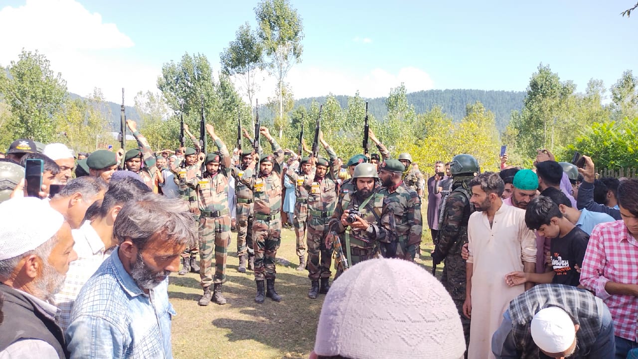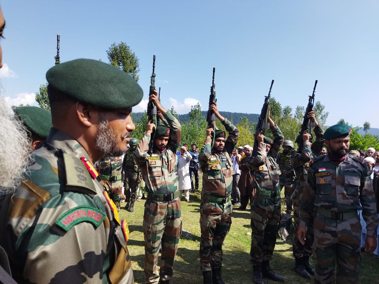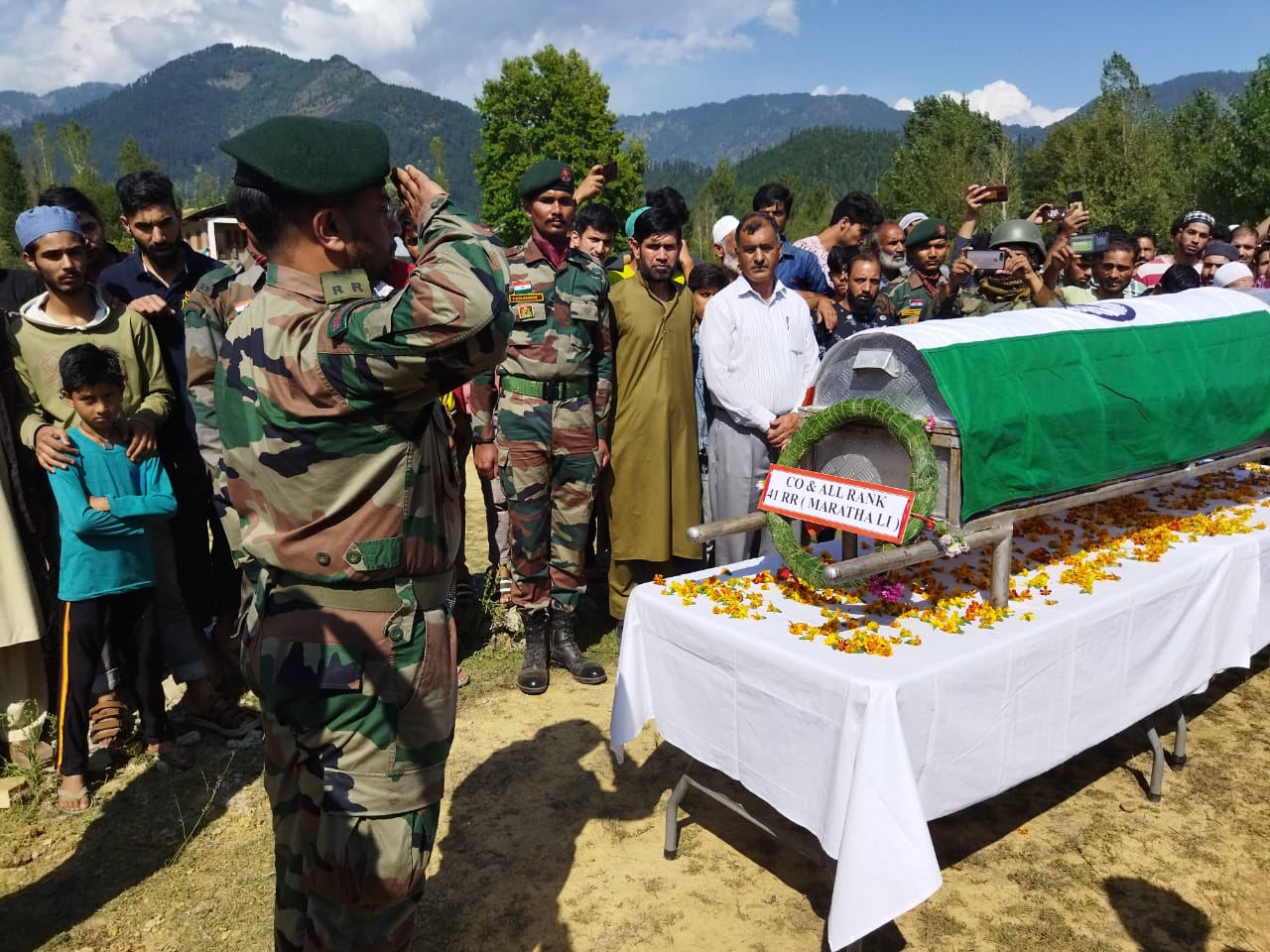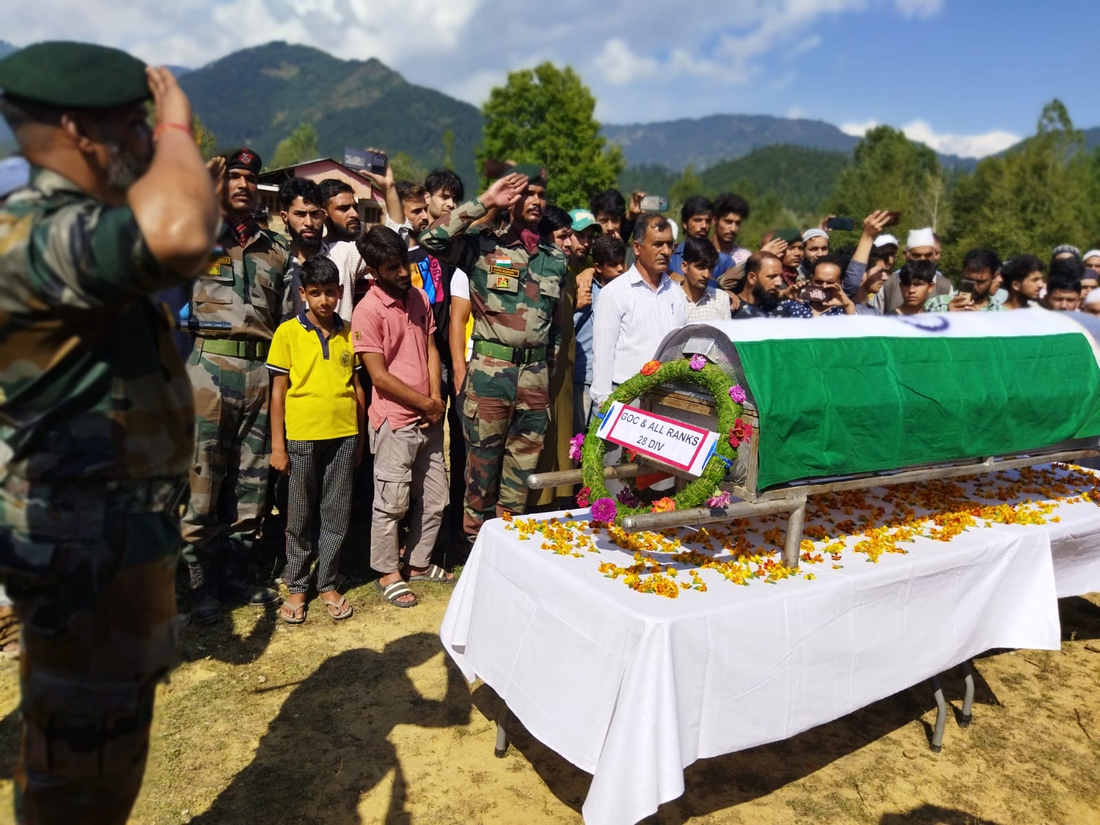 The mortal remains reached Gundsena on 21 Sep 21. Indian Army took part in the Janaza Namaz, wreaths on behalf of GOC and all ranks of Vajr Division were laid and National Flag was handed over to the father. Presence of 400 people at the Janaza was a testimony of love and respect for the deceased soldier from Indian Army.