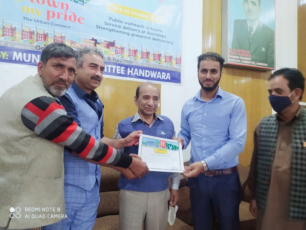 Handwara,October 21: On the occasion of “My Town My Pride”, Mohammad Rafi (KAS) Director Panchayats Kashmir and visiting officer Handwara, today felicitated BDO Handwara Mohammad Iqbal Zargar (KAS ) during the conclusion Ceremony of My town My pride in Handwara.