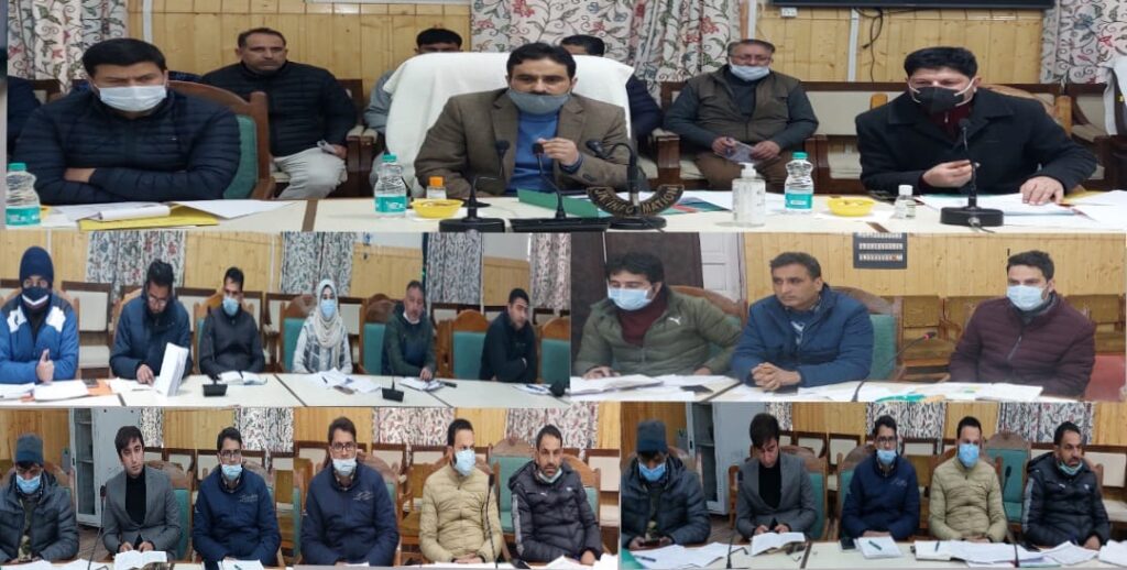 KUPWARA, FEBRUARY 15: Director, Rural Development Department (RDD) Kashmir, Tariq Ahmad Zargar today chaired a meeting of concerned officers to review the progress of developmental works under various schemes being implemented by RDD in Kupwara district. It was informed in the meeting that Rs.1222.30 lakh have been approved under Community Development (including BDC/DDC Office) for the year 2021-22 out of which Rs.364.54 lakh have been received and Rs.150.59 have been expended so far. Regarding physical achievement, it was informed that 250 works were approved in the current financial year out of which 210 were taken up and 88 works have been completed till date. It was also informed that under Rashtriya Gram Swaraj Abhiyan (RGSA) Kupwara, Rs.353.90 lakh have been approved out of which Rs.245.88 lakh were received and Rs.123.18 lakh have been expended. On the occasion, the Director RDD stressed upon the officers to gear up the pace of work and ensure completion of all ongoing works within the stipulated timeframe. Earlier, the Director took block wise review of the works going on in the various blocks of the district. ACD Kupwara, Mehraj-u-din Shah; ACP, BDOs, XEN REW, AEEs and other concerned attended the meeting.