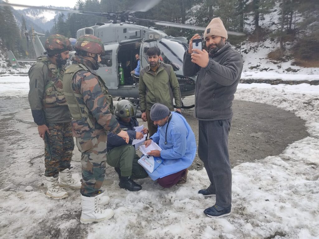 KUPWARA, FEBRUARY 02: Continuing its efforts to provide better possible facilities to the people living in hilly and farflung areas, District Administration Kupwara in coordination with Army and other authorities airlifted one female Patient namely Sahana khatoon from keran to Zangli kupwara. From Zangli, the patient was taken to Sub District Hospital (SDH), kupwara in ambulance which was kept available by the Hospital Administration.