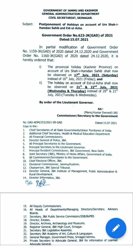 “In partial modification of Government Order No. 1159-JK(GAD) of 2020 dated 24.12.2020 and Government Order No. 1160-JK(GAD) of 2020 dated 24.12.2020, it is hereby ordered that the provincial holiday (Kashmir Province) on account of Urs Shah-i-Hamdan Sahib shall now be observed on 17 July, 2021 (Saturday) instead of 16t July, 2021 (Friday),” reads a government order, a copy of which lies with kupwaratimes.com