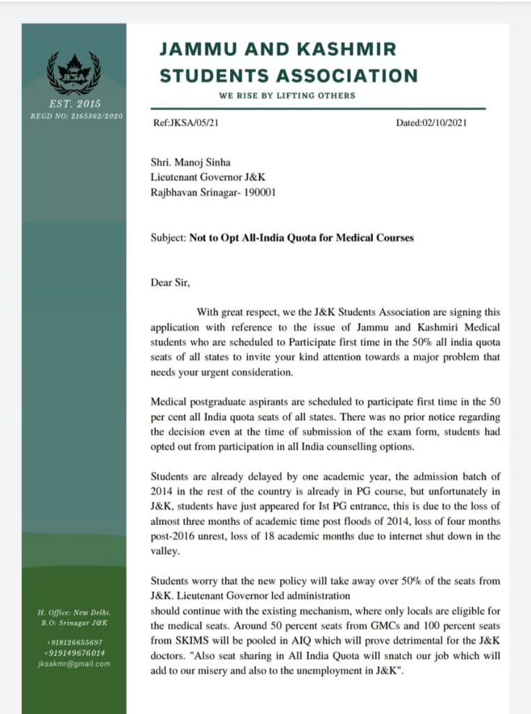 Srinagar,October 2: J&K Students Association here on today urged Jammu and Kashmir Lieutenant Governor Manoj Sinha not to participate in All-India Quota (AIQ) for admission to medical postgraduate aspirants who are scheduled to participate first time in the 50 per cent all India quota seats of all states.