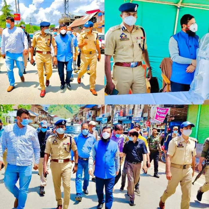 Kupwara, May 18 : To ensure strict implementation of Corona Curfew and adhering of guidelines issued by Government in view of COVID-19 Pandemic, SSP Kupwara, Dr.G.V Sundeep Chakravarthy (IPS) , Deputy Commissioner Kupwara, Imam Din (KAS) and Chairman Muncipal Council Kupwara Reyaz Ahmad Mir Conducted market Checking of Town Kupwara and its adjacent areas and checked nakasdeployed at different locations of the District Kupwara.