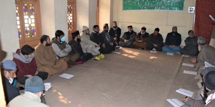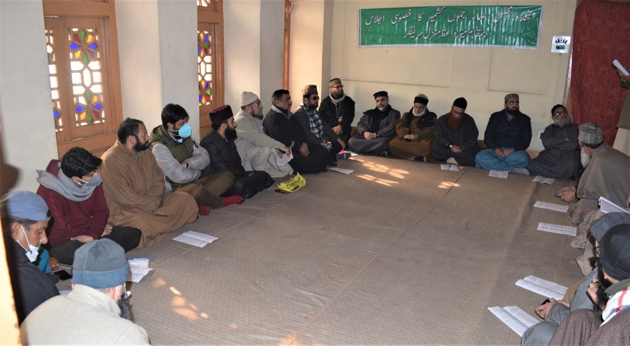 Srinagar, CNS,14- Dec: A meeting of Muttahida Majlis-e-Ulema Jammu & Kashmir was held at Mirwaiz Manzil Rajouri Kadal, Srinagar, after authorities disallowed it to be held at the Anjuman Auqaf headquarters at Jama Masjid Srinagar. The meeting was presided over by the leading Islamic scholar of J&K Mufti Nazir Ahmad Qasmi, as MMU president Mirwaiz Umar Farooq continues to be under house detention for the past two and a half years since August 5th 2019.