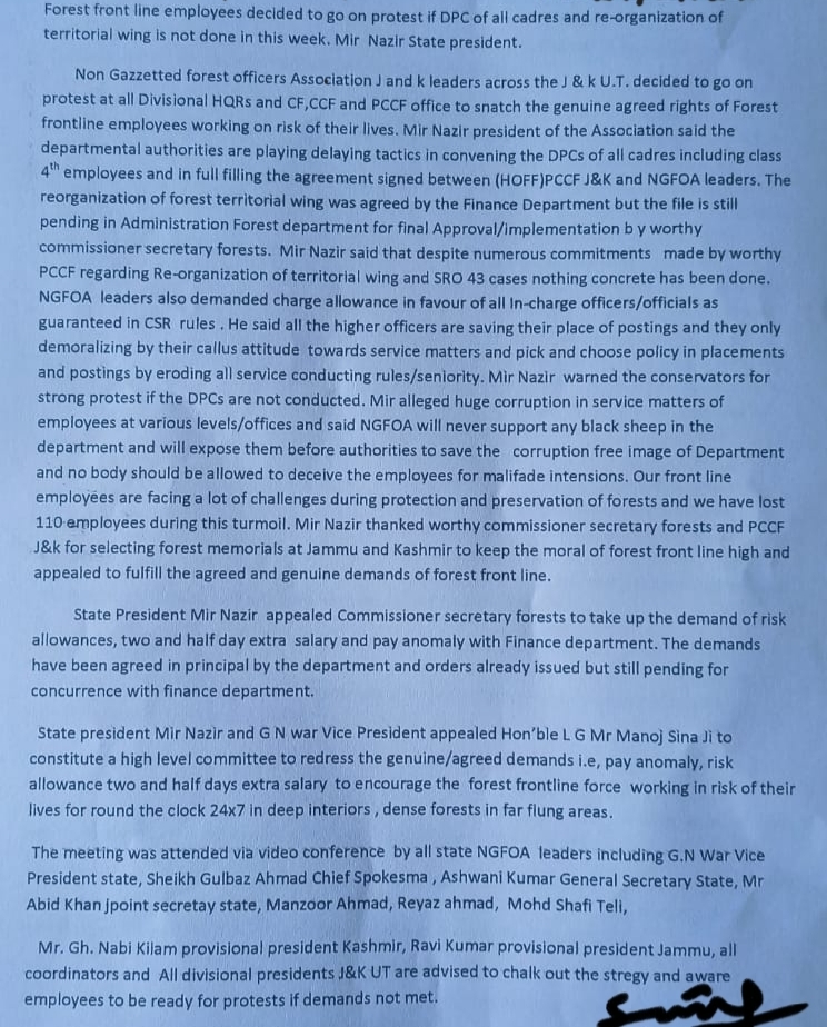 Kupwara:- Non Gazetted Forest Officers Association decided to go on indefinite strike if genuine demands not fulfilled.