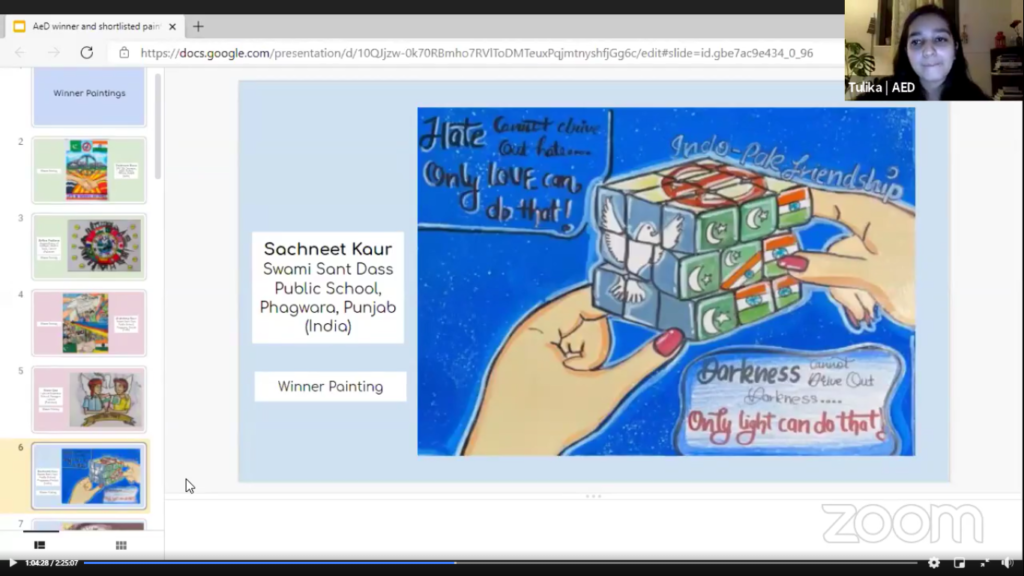 This peace calendar is a collection of selected paintings of Pakistani and Indian school students along with messages from 12 renowned persons from both countries who favor Indo-Pak Peace. This was the ninth year of the initiative and peace calendar. In earlier years, these calendars have been launched in several cities of India and Pakistan but owing to COVID19, the launch was shifted online – which encouraged bringing together of speakers, students, and audiences from both sides, something that was not possible in the physical world owing to visa issues.