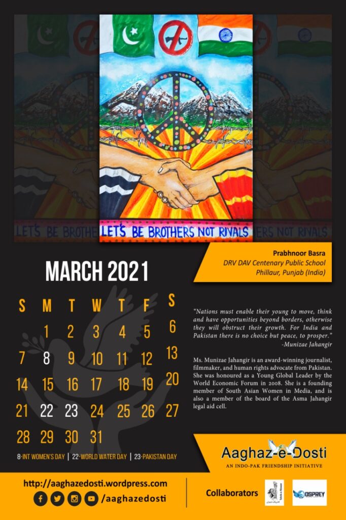 The 9th Indo-Pak Peace Calendar 2021 is launched online today by Aaghaz-e-Dosti, an Indo-Pak Friendship Initiative that works voluntarily on fostering people to people relations between India and Pakistan mainly through peace education activities. This year, Aaghaz-e-Dosti collaborated with Tehrik-e-Niswan for a peace calendar.