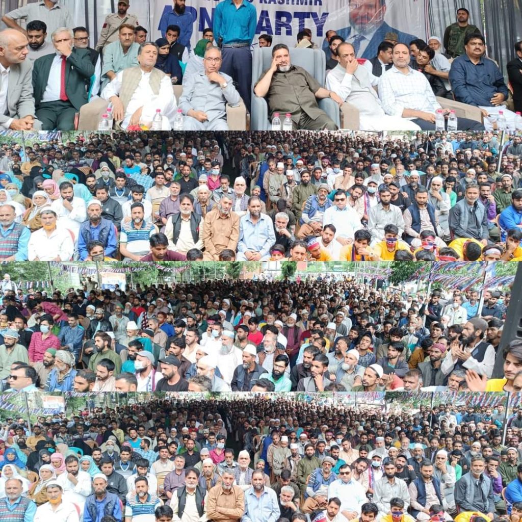 Syed Mohammad Altaf Bukhari was addressing a grand public rally at north Kashmir’s Kupwara, wherein people and party workers gave him a rousing reception on his arrival at the venue. The workers, wearing similar outfits, were raising slogans hailing their leader at the rally.