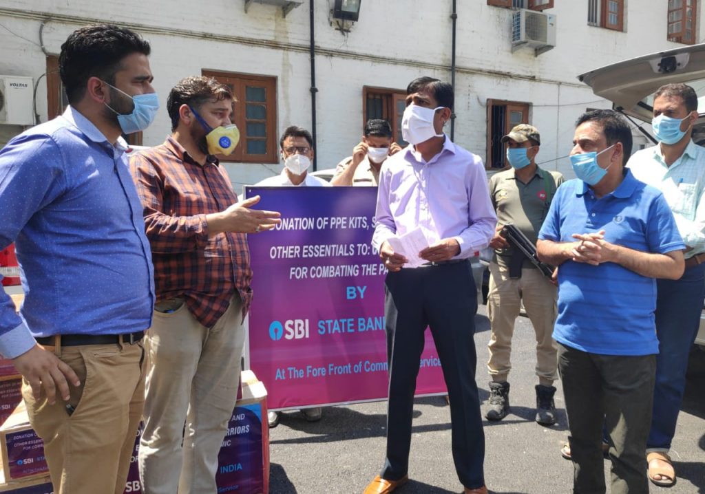 Kupwara, July 16: State Bank of India, Kupwara Branch today donated Personal Protection Equipment kits to District Administration Kupwara, which include 10 Laminated PPE kits, 25 N-95 masks, 80 packets of triple layer masks, 15 packets of melt blown masks, 35 PPE kits, 75 sanitizers 500 ml, 4 sanitizers 5 ltr, 20 sanitizers 1 ltr spray and 1 sanitizer dispensing stand.
