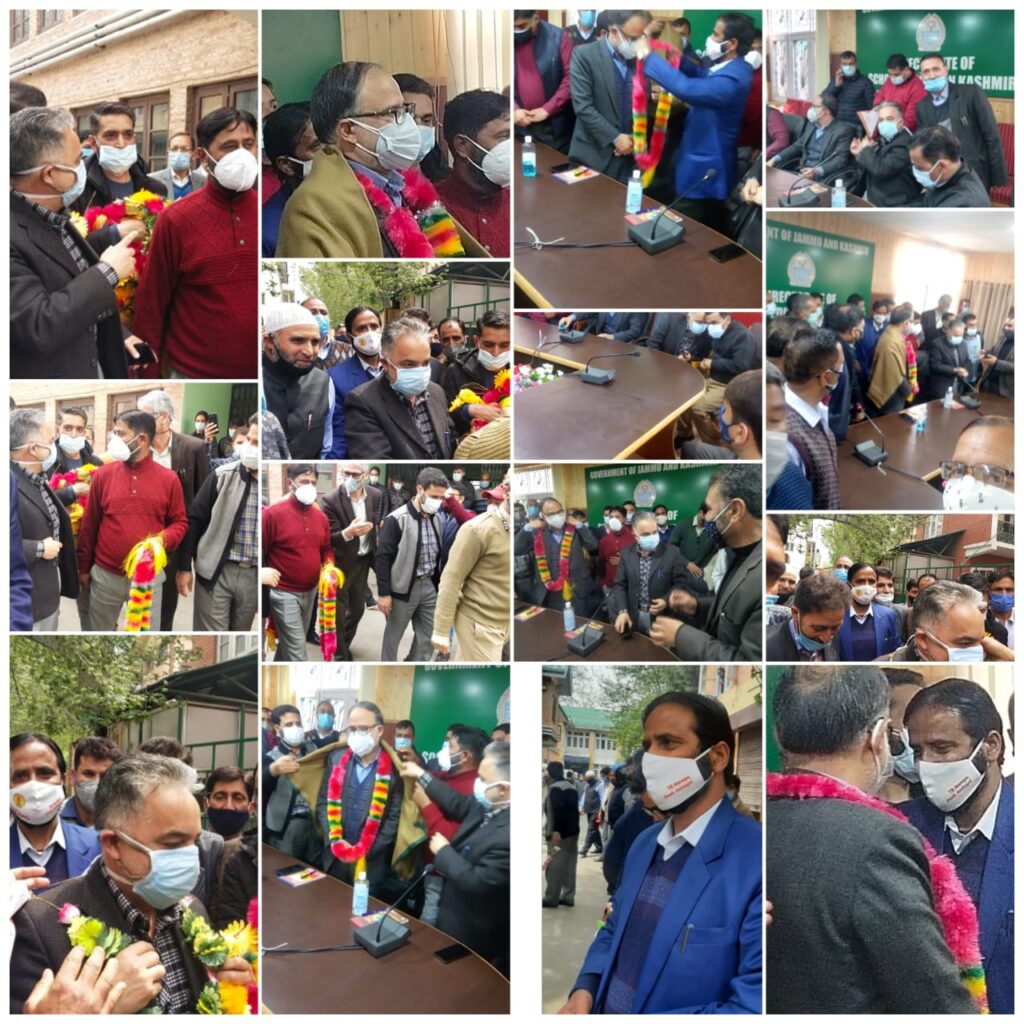 Srinagar, April 21: An impressive welcome and farewell function was held at conference hall of the Directorate by School Education Employees Coordination Committee in honour of the new incumbent Mr.Tasaduq Hussian and outgoing Director Janab Mohd.Younis Malik. DR.Tassudaq Hussian was received and garlanded by noted figures of SEECC with high degree of warmth,affection and love.