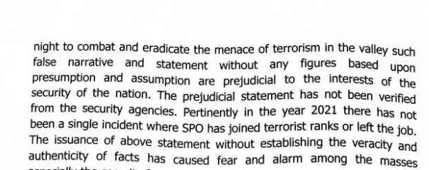 The notice says that on the 28th of June, a report was published with the headline “They have destroyed my family” where it was claimed, “In recent times, many SPO’s have resigned from services after facing threats from the militants while some have even joined the militancy.”