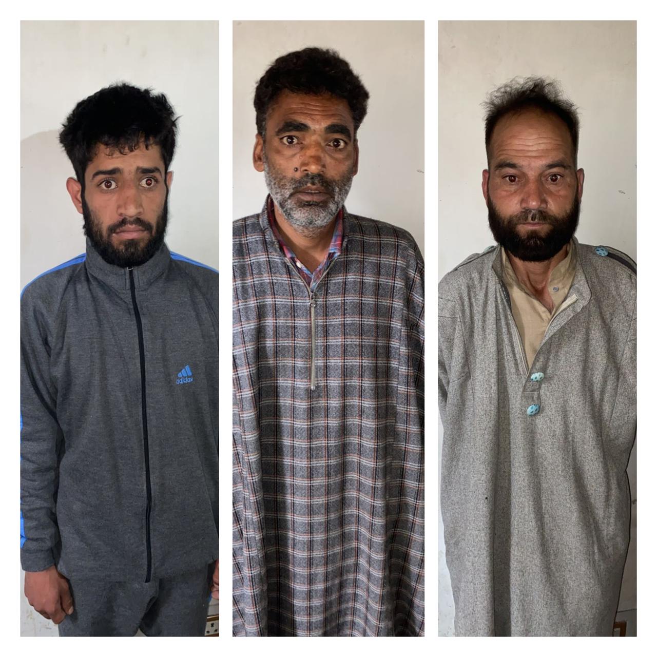 Kupwara police has arrested three persons involved in peddling of drugs in Kralpora area of the district. Acting on a specific information, a police team of Police Station Kralpora led by SHO Waseem Ahmad laid a naka at Wasulkhatu Kralpora and intercepted the trio while transporting the narcotics. The peddlers have been identified as Asghar Ali Khan son of Gh Hassan resident of Meelyal,